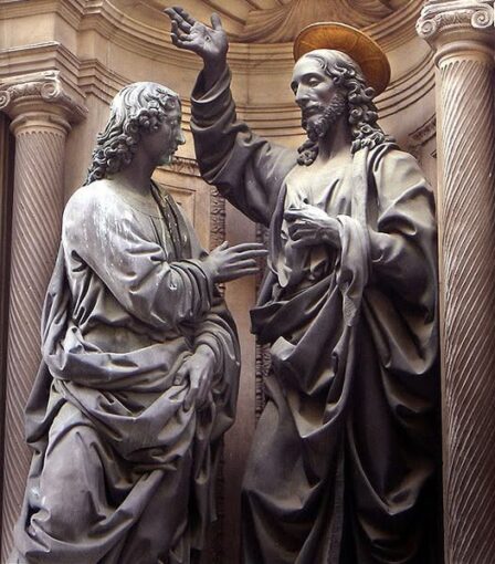 Yra žinoma, kad Šv. Tomas nepatikėjo, jog Jėzus Kristus prisikėlė visu kūnu ir norėjo patikrinti Mokytojo šoną, ar ten dar yra žaizda…Matote garsiąją Verrocchio (Leonardo da Vinci mokytojo) skulptūrą „Doubting Thomas“. Ją 1467–1483 m. sukūrė Andrea del Verrocchio. Ji yra Orsanmichele bažnyčios nišoje Florencijoje. Paveiksle Šv.Tomas, nustebęs ir nusilenkęs, tiesia ranką prie žaizdos, kad patikrintų stebuklą. Tai viena pirmųjų Renesanso bronzos skulptūrų, sukurtų viešam eksponavimui.